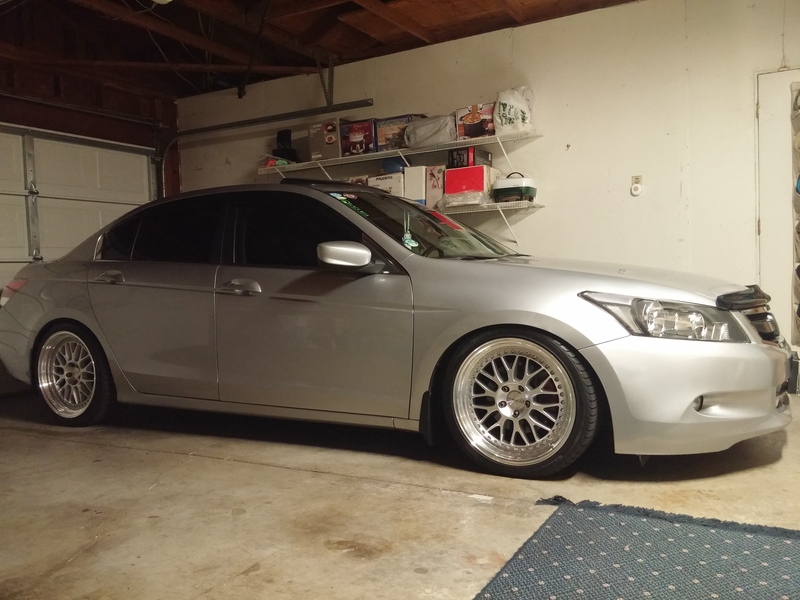 Car is lowered on Function And Form T1 Coil-overs. Adjustable camber arms are installed for the rears only.
