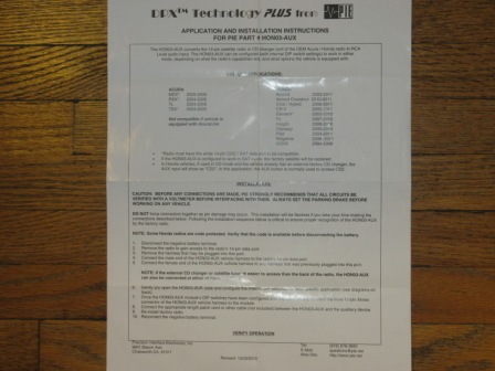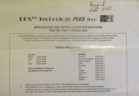 Precision Interface Electronics (PIE) part number HON03-Aux. It was installed in my 2006 Accord EX with 6 disc changer and satellite radio. Have instructions including Crutchfield instructions for removing radio.