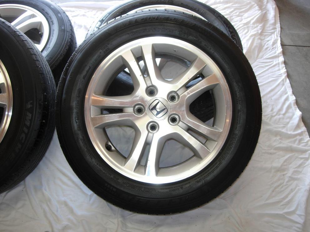 Up for grabs is a set of 4 wheels and tires from my 06 Accord EX-L. They are the original factory rims and tires. Tires are Michelin Energy MXV4, size 205/60/16, Load Rated 91, speed V. There is not much tread left on the tires so I can have the rubber pulled off which will save on shipping. The tread depths are (in 32nds of an inch) 3.5, 3.5, 5.1, 5.1. I ran them last summer and they rode smooth and straight. The rims have chips in the clear coat. There is some light rash on the lip of one rim.